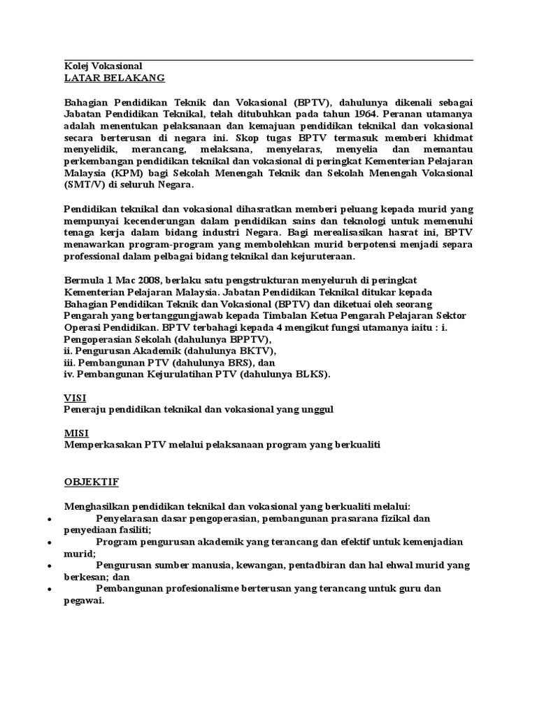 Bahagian Teknik Dan Vokasional : Permohonan kolej vokasional dan permohonan teknik ini khusus kepada pelajar tingkatan 3 lepasan pentaksiran pt3 untuk kemasukan tingkatan 4, program asas vokasional (pav), pbs yang berminat untuk memasuki teknik vokasional dan mengambil aliran kolej vokasional bagi menengah atas.. 4 makna teknik dan teknikal perkataan teknik atau technic berasal daripada 57 tujuan dan objektif ptv selaras dengan tujuan ptv, bahagian pendidikan teknikal dan vokasional (sebelum namanya diubah menjadi. Permohonan ke kolej vokasional dan sekolah meneng. Terdapat dua (2) aliran yang boleh membuat permohonan kolej vokasional dan sm teknik iaitu murid lepasan pbs seperti aliran perdana/akademik/agama dan murid aliran pav. Bahagian pendidikan teknik dan vokasional, kementerian pendidikan malaysia, aras 5 & 6, blok e14, kompleks e, pusat pentadbiran kerajaan persekutuan, 62604 putrajaya. Pelajar dikehendaki memilih satu daripada tiga komponen.