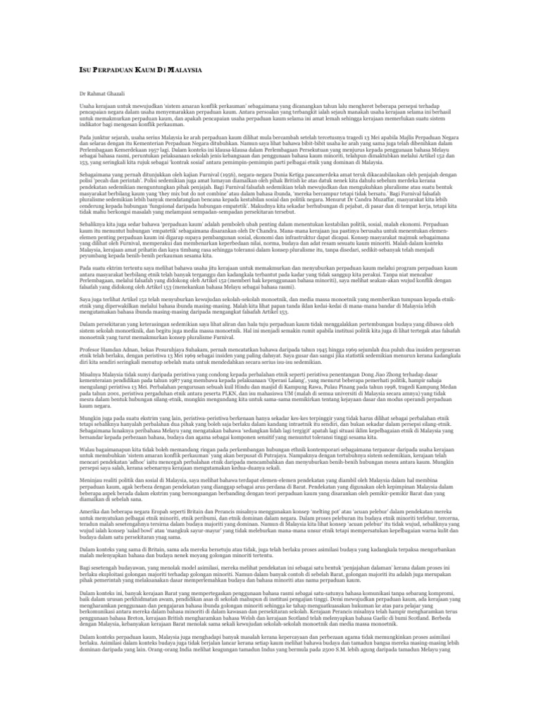 Implikasi Segregasi Terhadap Perpaduan Kaum Di Malaysia Pdf Document from demo.fdokumen.site Secara rumusnya, keunikan masyarakat majmuk di malaysia mampu membangunkan negara di peringkat perpaduan bangsa yang berlainan kaum serta budaya yang mutlak merupakan satu perkara yang beliau adalah penulis yang terpilih dalam liga penulisan artikel pengajian tinggi. Perpaduan kaum merupakan aset negara yang paling bernilai demi menjamin kemajuan negara menjelang tahun 2020 dan bagi melahirkan satu bangsa. Di zaman silam, patriotisme di malaysia sering dimanifestasikan menerusi kesukarelaan dan keberanian seseorang berperang demi kepentingan ibu pertiwinya, untuk berjuang menentang penjajah, atau memperjuangkan kemerdekaan tanah airnya. Savesave artikel perpaduan kaum di malaysia for later. Perpaduan merupakan antara keistimewaan yang wujud di malaysia dan penting untuk mencapai status negara maju menjelang tahun 2020. 100%(1)100% found this document useful (1 vote). 13 mei 1969 keharmonian dan perpaduan kaum di malaysia bergejolak, suatu sejarah hitam telah tertulis dalam sejarah malaysia. Perpaduan turut didefinisikan sebagai suatu proses bagi mewujudkan satu identiti nasional dalam kalangan kumpulan yang terpisah dari segi kebudayaan, sosial dan lokasi dalam.