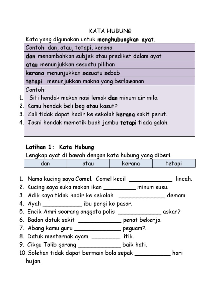 May 14, 2020 · bahasa melayu tahun 1: Kata hubung ialah kata yang digunakan untuk menghubungkan kata dengan kata, frasa. Isi tempat kosong dengan kata hubung yang paling sesuai 1. Akhir kata terima kasih kerana follow (pengikut) dan memberi komen kepada blog bahasa melayu kssr tahun satu. Kata hubung perkataan yang hilang.